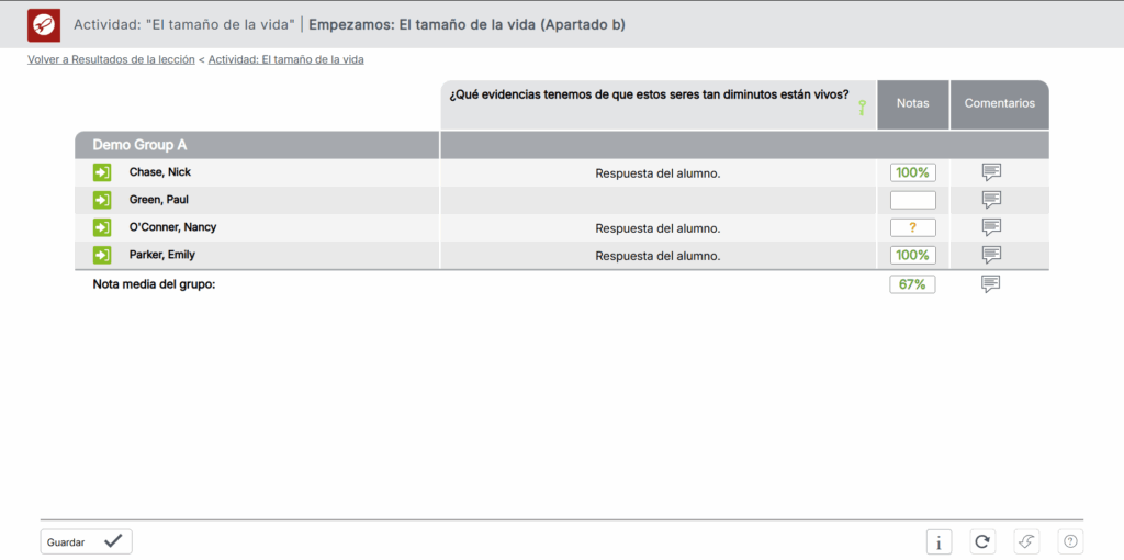 Ya es posible añadir comentarios del docente a nivel grupal desde la tabla de resultados en cualquier actividad. Al igual que con la calificación manual en las preguntas de respuesta abierta, ahora puedes asignar un comentario común a todo el grupo y, si lo deseas, personalizarlo posteriormente para cada estudiante de forma individual.